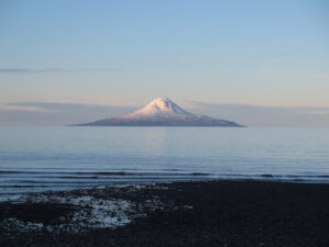 Mt. Augustine volcano sits in the middle of Kamishak Bay. The area is rife with rocks and reefs, making navigation extremely tricky.