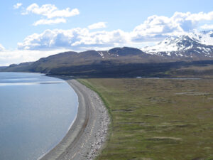 Looking south across the beach, storm berm and wetlands at Amakdedori Creek. Pebble would transform this area into an industrialized export facility.