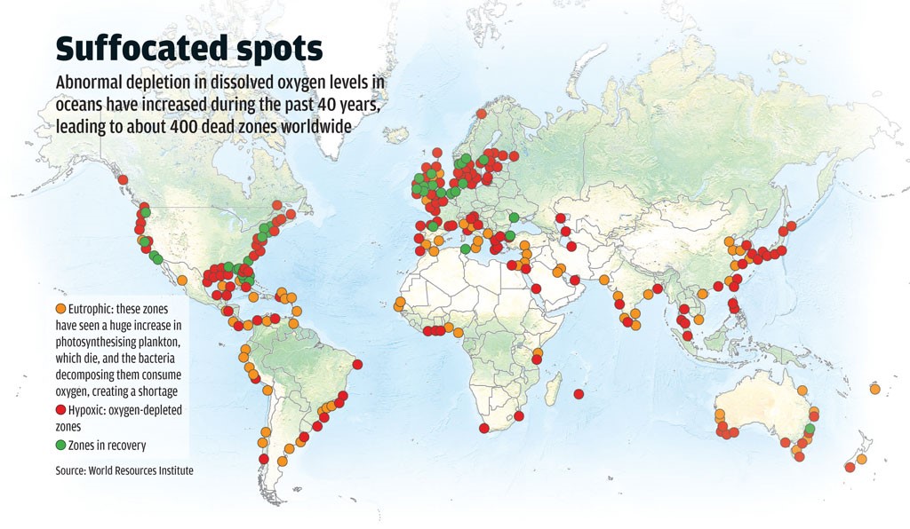 Hypoxic zones, also known as “dead zones,” refer to areas of where there is less oxygen dissolved in the water, causing most marine life to die or leave the area, transforming once thriving areas into “biological deserts.”  While some dead zones occur naturally, human-caused nutrient pollution (from agricultural runoff land for example) and wastewater discharge are major causes, stimulating “an overgrowth of algae, which then sinks and decomposes in the water.”  Decomposition consumes oxygen, leaving little for marine life. In the US, dead zones are found along the East Coast and the Great Lakes,” with the world’s second-largest dead zone in the northern Gulf of Mexico.