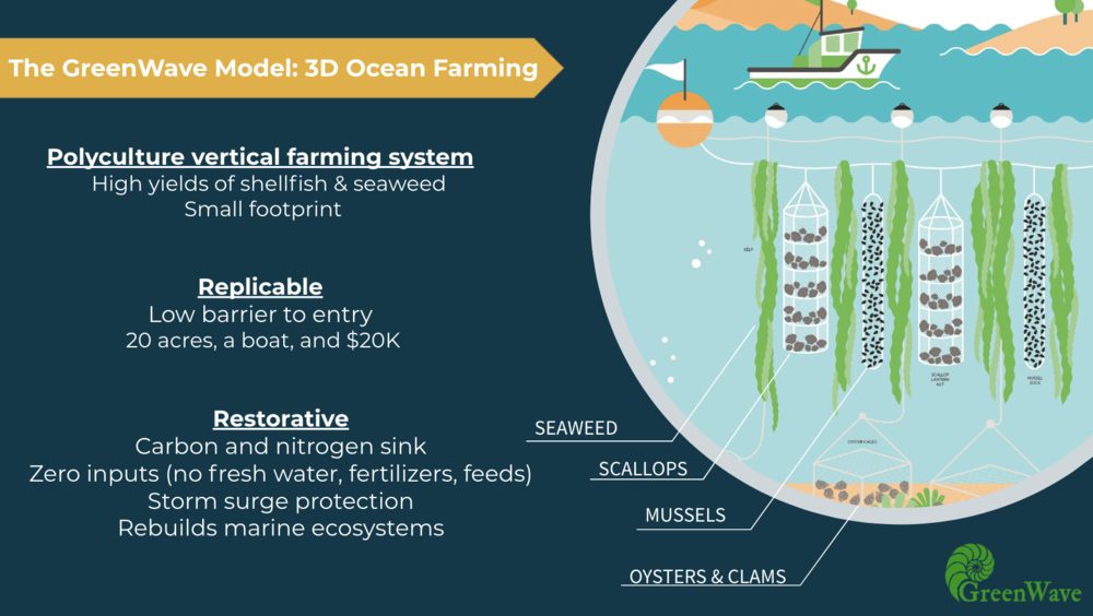 Based on the success of his own ocean farm, Bren Smith, the owner and operator of Thimble Island Ocean Farm (TIOC), founded GreenWave, a non-profit “dedicated to training and supporting regenerative ocean farmers in the era of climate change… to create a blue-green economy—built and led by regenerative ocean farmers—that ensures that we can all make a living on a living planet.” The organization’s mission is “to restore marine ecosystems by creating 3D ocean farms that provide habitats for thousands of fish, filter the water of deadly carbon and nitrogen, and grow tons of sustainable shellfish and sea plants.” Using TIOC as a model, GreenWave is accomplishing these goals through farmer training, resources, and support, in addition to value-added research, infrastructure development, and hatchery services. They also are helping to build markets through a Buyers Network, bringing together “regenerative ocean farmers and buyers across diverse industries in mutually beneficial relationships that support thriving farms, coastal communities, and marine ecosystems.”