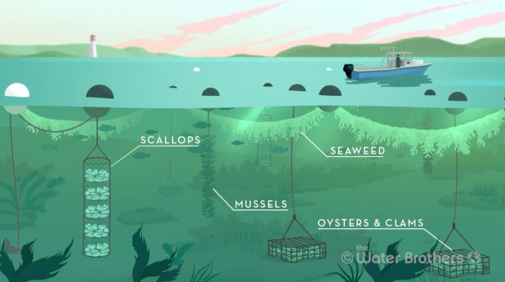 Functionally, the farm is essentially “an underwater garden” says Smith, “one with hurricane proof anchors on the edges.” About eight feet below the surface, the garden begins. The kelp and other seaweeds grow on vertical columns, followed by shellfish like scallops and mussels. At the bottom of the garden are  cages of oysters and clams on the ocean floor, hanging and attached to horizontal ropes.  Furthermore, regenerative ocean farming means “growing seaweed and shellfish (oysters, mussels, clams) in many small coastal underwater gardens of a few acres each, not constructing more industrial salmon farms.” In addition, “seaweeds and shellfish don’t need to be fed; they grow with just sunlight and the nutrients and plankton already in seawater.”