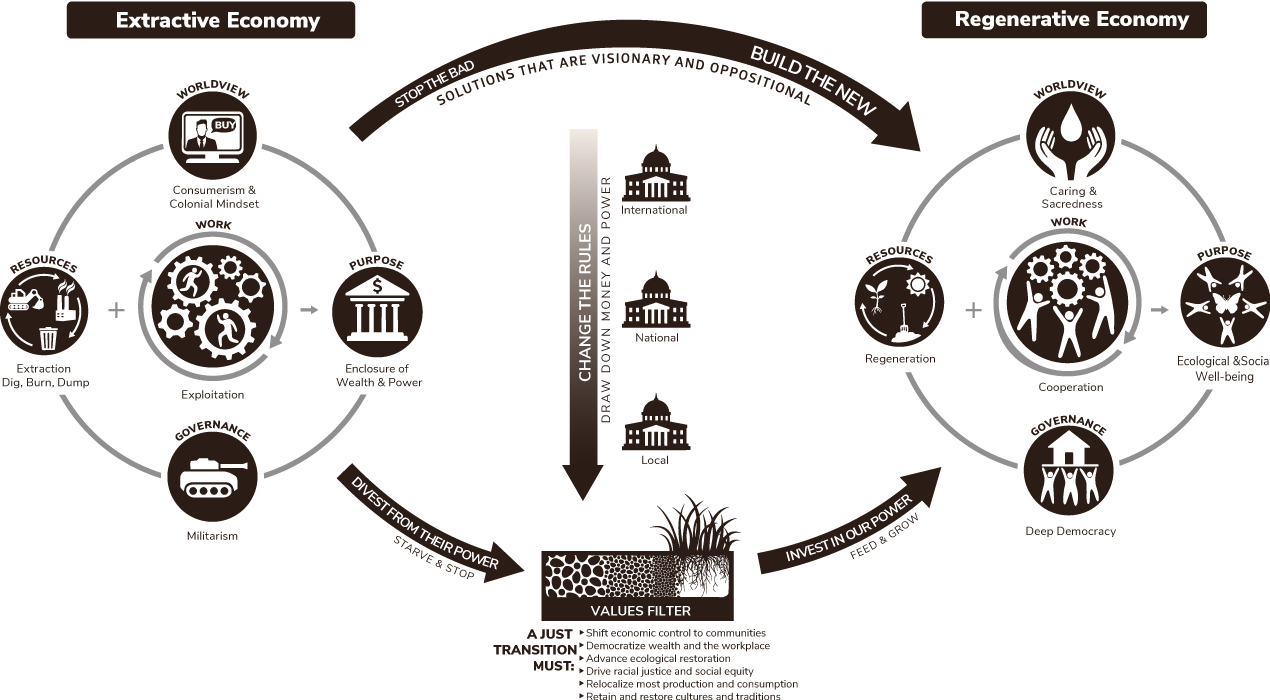 So what is a Just Transition? Just Transition initiatives shift the economy from dirty energy to community-controlled energy: from funding new roads to expanding public transit, from incinerators and landfills to zero waste, from industrial food systems to food sovereignty, from homelessness to self-determined communities, and from rampant destructive development to ecosystem restoration. The core of Just Transition is deep democracy and decolonization, wherein workers and communities have control over the decisions that affect their daily lives and traditional lands.